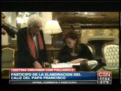 La presidenta Cristina Fernández recibió anoche, en su despacho de Casa de Gobierno, al orfebre argentino Juan Carlos Pallarols, quien está confeccionando el cáliz que usará el Papa Francisco durante su Pontificado. El artista le pidió a la mandataria que participe en el cincelado de la pieza.